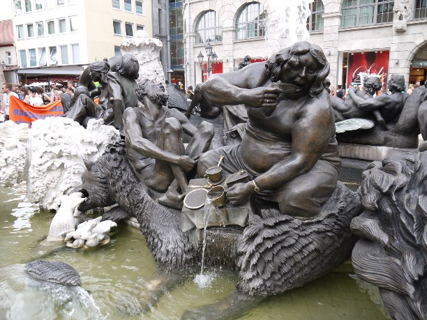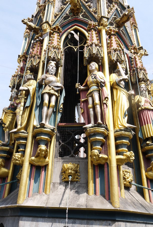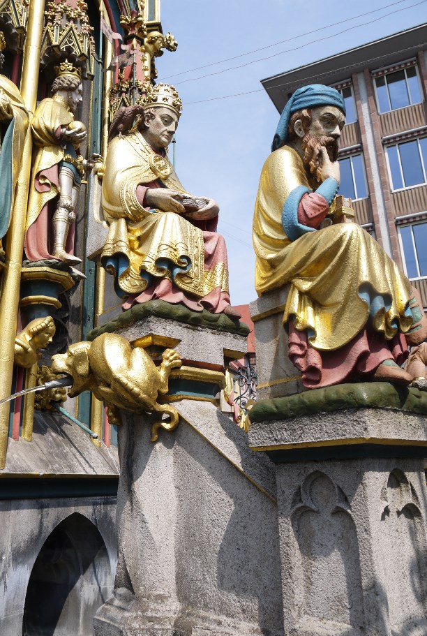 Согласно авторскому замыслу, фонтан должен был отобразить средневековую систему ценностей: в верхнем ряду - древние пророки, в среднем - курфюрсты (князья с правом выбора императора) и герои легенд, в нижнем – учёные и мыслители, за их спинами апостолы-евангелисты. Самая нижняя часть отдана многочисленным чудищам и ухмыляющимся рожам, они были призваны отпугивать нечистую силу.