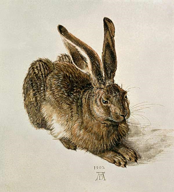 Удивительное дело, но именно скромная акварель «Заяц» по сей день бьет рекорды популярности среди всех работ Дюрера :) Говорят, заяц нарисован с натуры и в его зрачках даже отражается оконный переплёт. Вспоминая Дюрера, все сразу же вспоминают его «Зайца». Как будто и не рисовал он больше ничего стОящего.