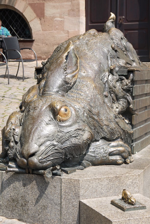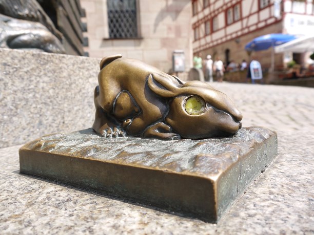 Рядом с монстром стоит ещё один постамент(ик) - на нём расположился крошечный зайчонок, отполированный до золотистого блеска. Видно тот самый! Собирающий лавры с 1502 года :)
