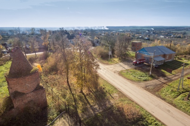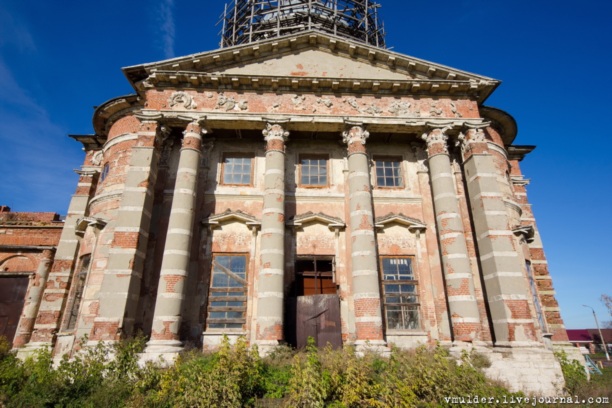 Огромный кирпичный четырехстолпный однокупольный собор в стиле зрелого классицизма с трапезной и колокольней. Сооружен в 1810-1850 на месте кирпичного храма 1736-1738, от которого осталась шатровая колокольня. В главном храме боковые приделы Георгиевский и Иоанна Воина, в трапезной Ильинский и Богоматери Троеручица. В годы советской власти здесь был склад. Впоследствии он пришел в запустение. Вообще, удивляет столь огромный собор для столь маленького посёлка.