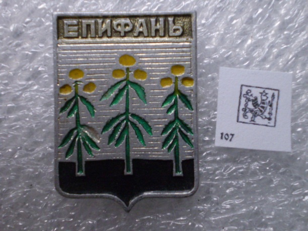 От былого размаха Епифани остался герб, да не простой: «На серебряном поле – чёрная земля, из которой произрастают три былины конопляные, показуя, что окрестности сего города изобилуют коноплей». Конопля - главное достояние города до революции. Со стародавних времен епифанцы делали пеньку. Вот такой вот герб Города. Вот такие значки можно купить в Епифани :)