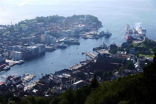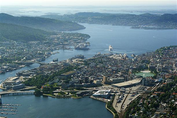 Берген - второй по величине город Норвегии, и до 1299 года он даже был её столицей.  К слову, 270 тысяч жителей – это как ДВА наших Новомосковска по количеству душ, но живущих на площади, которая в ШЕСТЬ раз больше! С высоты птичьего полёта Берген выглядит так.