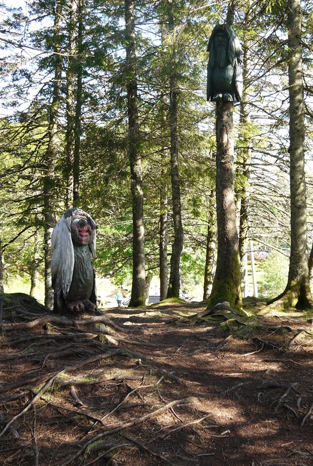 На склонах Флёйена абсолютно сказочный лес с деревьями-великанами, среди которых «живут» тролли (их фигурки повсюду) и встречаются таблички «Ведьмам не летать!».