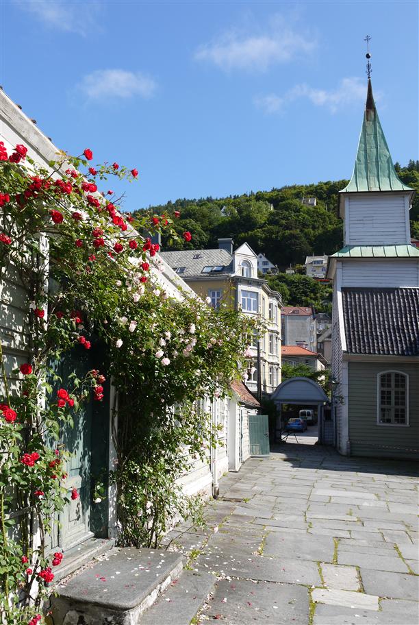 На выходе из вокзала - "белый квартал". Игрушечные деревянные домики, мощёные улочки и цветы повсюду! Берген очаровал нас с первых же шагов.