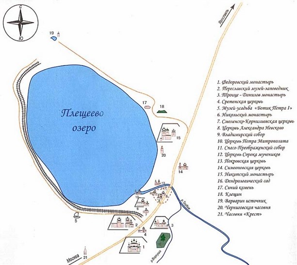 Переславль-Залесский — расположен в 140 километрах от Москвы, на трассе М8  «Холмогоры» Москва — Архангельск, на берегу Плещеева озера, основан в 1152 году князем Юрием Долгоруким. Входит в Золотое кольцо России .
