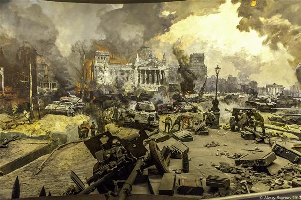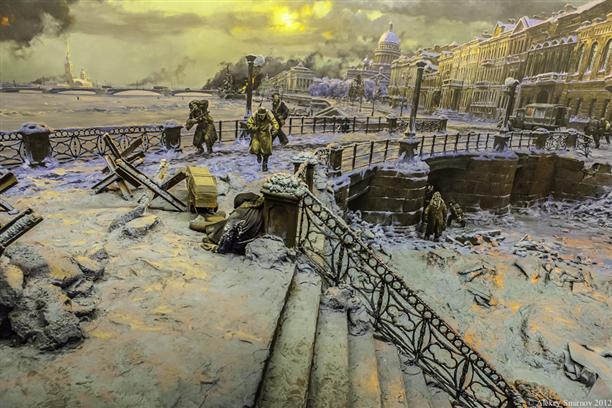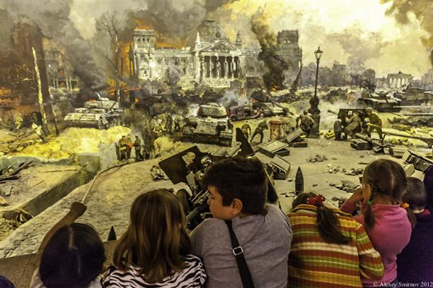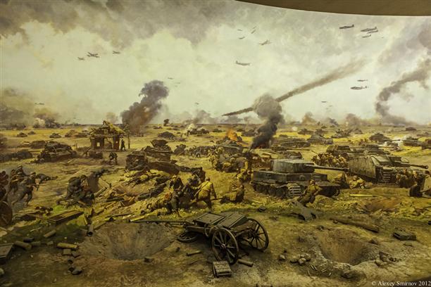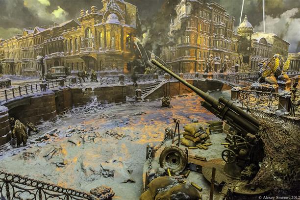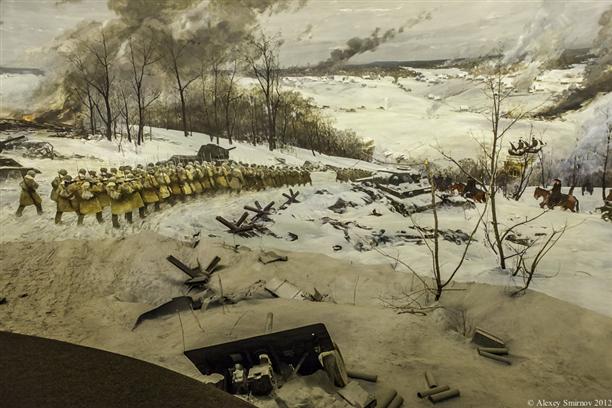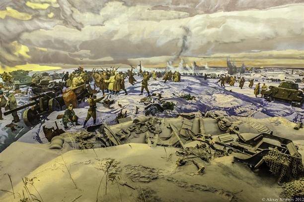 На первом этаже музея есть несколько залов с диорамами. Нельзя сказать, что очень впечатляюще сделано, но, когда включают звуковое сопровождение (звуки бомбежек, крики атаки, свист пуль и голос Левитана), пробирает до мурашек. Иногда до слез.