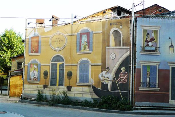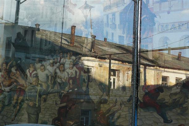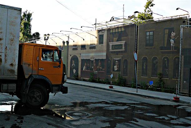 А вот это! :) Понятно, что не от жизни хорошей... но ведь жизнерадостно. Очень полюбила этот переулок :)) Издалека приняла его за реальный. Там несколько таких домов. Стоят рядом с кинотеатром "малина". Сначала смотрится все просто красивой картинкой, а потом видишь, как через сетку светятся реальные фасады старых домов... инфернально!
