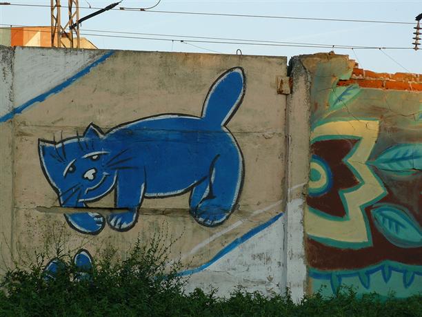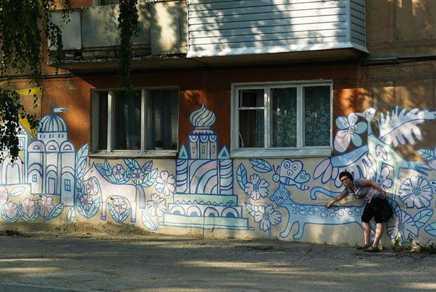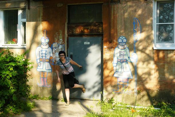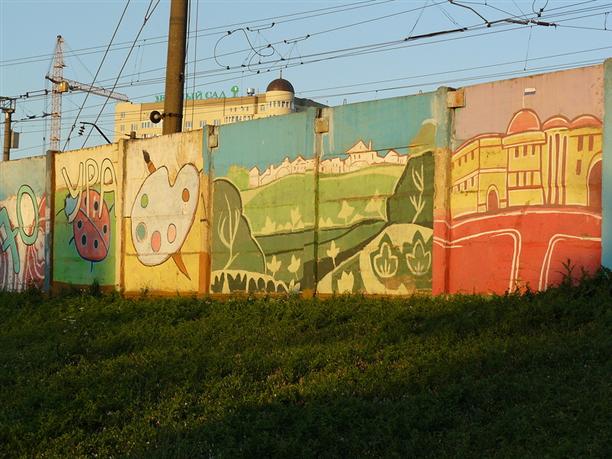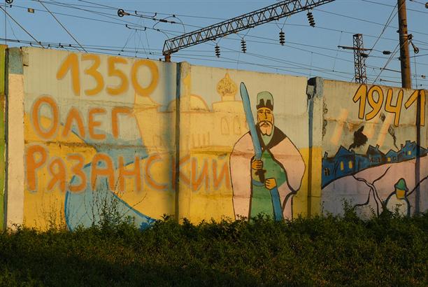 Уже на выезде из Рязани встретилась расписная стена :) с лошадками, котиками и Олегом Рязанским :)))