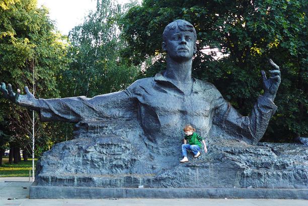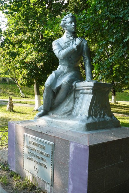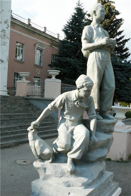 У Дворца детского и юношеского творчества все еще стоят пионеры :) почему-то выкрашенные в цвет цемента. Недалеко от пионеров Пушкин того же окраса. Кстати, никак не пойму, что за символика внизу плиты на постаменте Пушкина?.. Какой-то маленький очкарик.