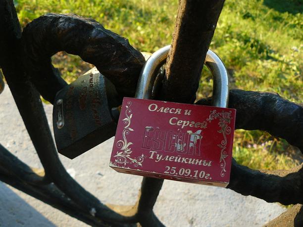 На набережной стройными рядами "свадебные замки". Но никаких бутылок из-под шампанского, никаких осколков и разорванных воздушных шаров. И что? Разве так бывает?! :)) в Туле-то за мостом через Воронку просто горы свадебного мусора :((( Каждый жених считает своим долгом разбить бутылку о перила и выкинуть за мост (на счастье! интересно, на чье?)