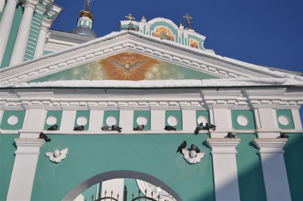 А вот так голуби греются в лучах солнца, на воротах Успенского собора.
