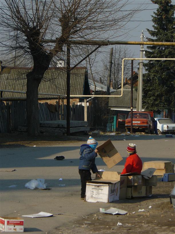 На ней самозабвенно играют маленькие белёвцы... По одной из наших версий, на Никольской проходят городские ярмарки, отсюда столько мусора и пустых картонных коробок! Но нет, не угадали! Сворачиваем на другую улицу, а там опять, "ярмарка"! :)))