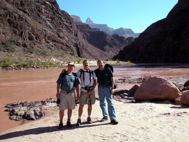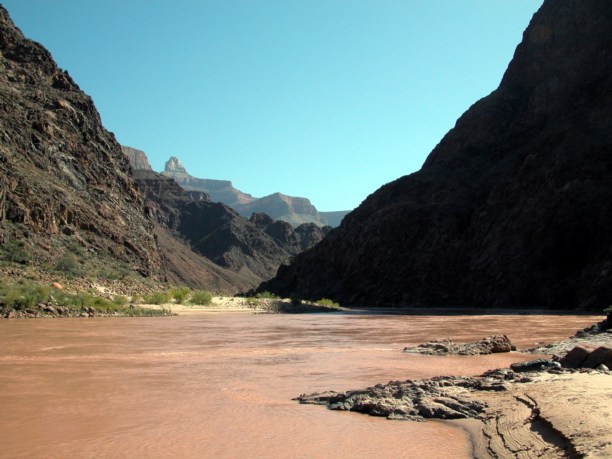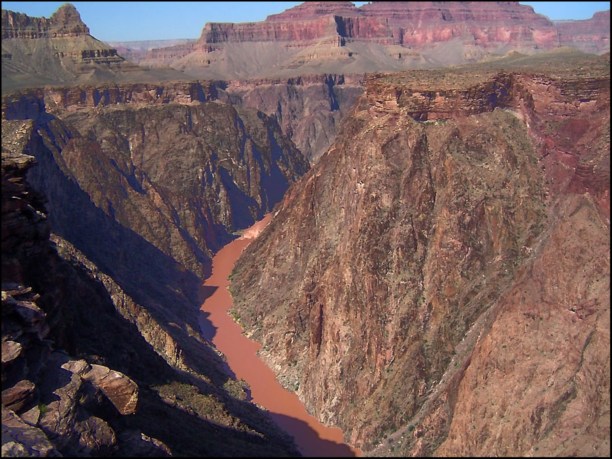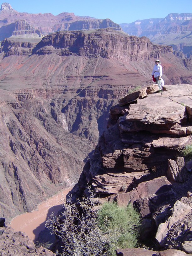 Видно слишком многие не правильно расчитывают свои силы, поэтому в самом начале маршрута постоянно висят призывы, учитывать, что время подъёма в два-два с половиной раза больше времени спуска, и даже и не пытаться сделать его одним днём. Это как жизнь в кредит: спускаешься легко и быстро, а расплачиваться приходится долго и упорно при подъёме. Короче, мы решили что каждый движется по персональному графику и поворачивает назад когда посчитает нужным. Благо потеряться или заблудиться нет никакой возможности, тропа одна и свернуть с неё нельзя. Хорошую службу нам здесь сослужили портативные рации. В результате трое наших мадам спустились совсем немного и уже к середине дня поднялись назад, группа из пяти человек не дошла метров 250-300 по вертикали до дна каньона, свернула на плато и вышла к последней кромке перед рекой, на отвесную скалу с которой и наблюдала как трое нас, мужиков всё-таки дошли до Colorado River, до нижнего кемпграунда. Так что я помочил таки ноги в Colorado River в Grand Canyon'e (Через два дня мы ещё спускались на катамаране выше по течению перед началом Grand Canyon'a, в Glen Canyon'e.) Вода на дне Grand Canyon'a бурого цвета. Это хорошо видно на всех фотографиях в которые попала река. Ребята из кемпграунда сказали, что её нужно как минимум сутки отстаивать перед тем как начать фильтровать для питья. Иначе фильтры забиваются глиной и песком после первой же порции. Растительности внизу практически нет, что усугубляет и без того инопланетный пейзаж
