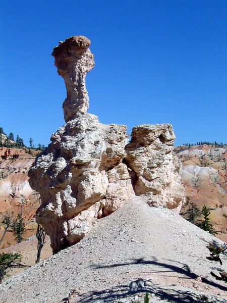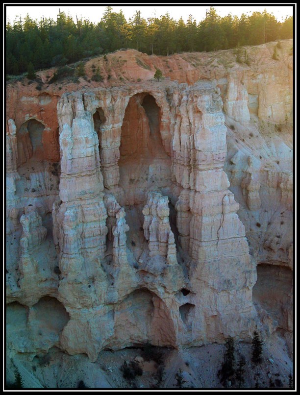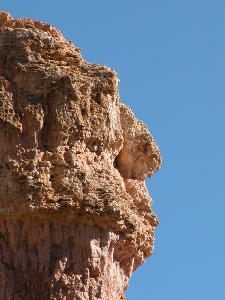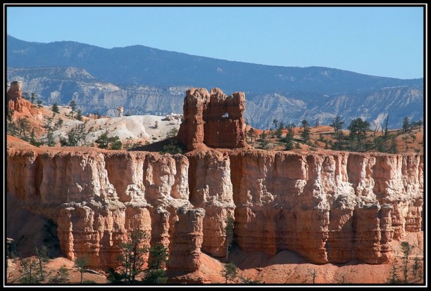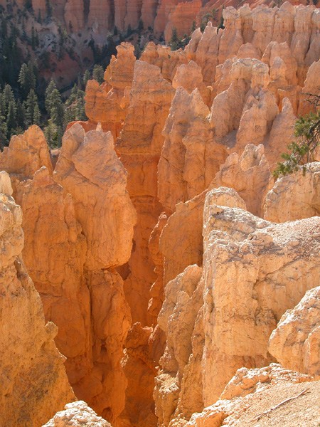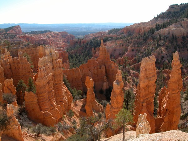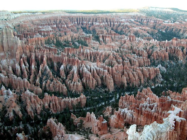 Если Grand Canyon поражает своей мощью и грандиозностью, то Bryce - изысканностью и воздушностью. Он относительно не глубок ~700-900 футов, и достаточно широк (я думаю несколько миль) так, что скорее напоминает ущелье между двух хребтов длиной около 15 миль. Зато отдельно торчащие повсюду пики напоминают кому сталактиты, а кому фаллосы.