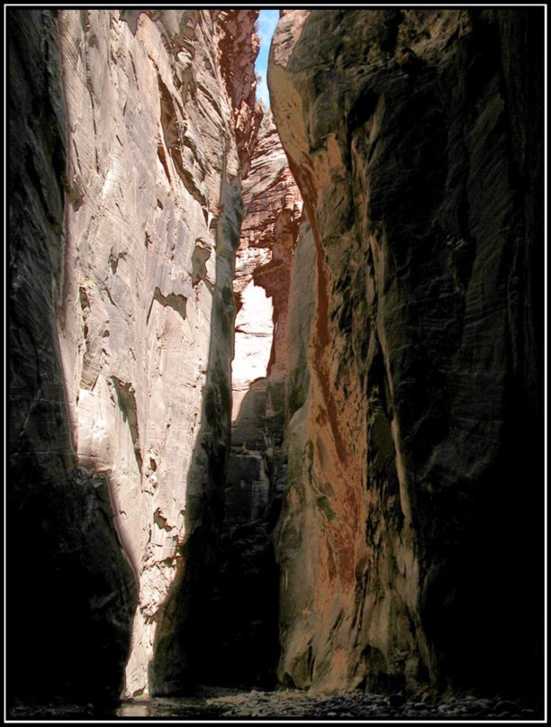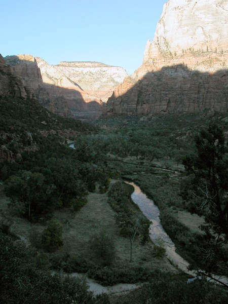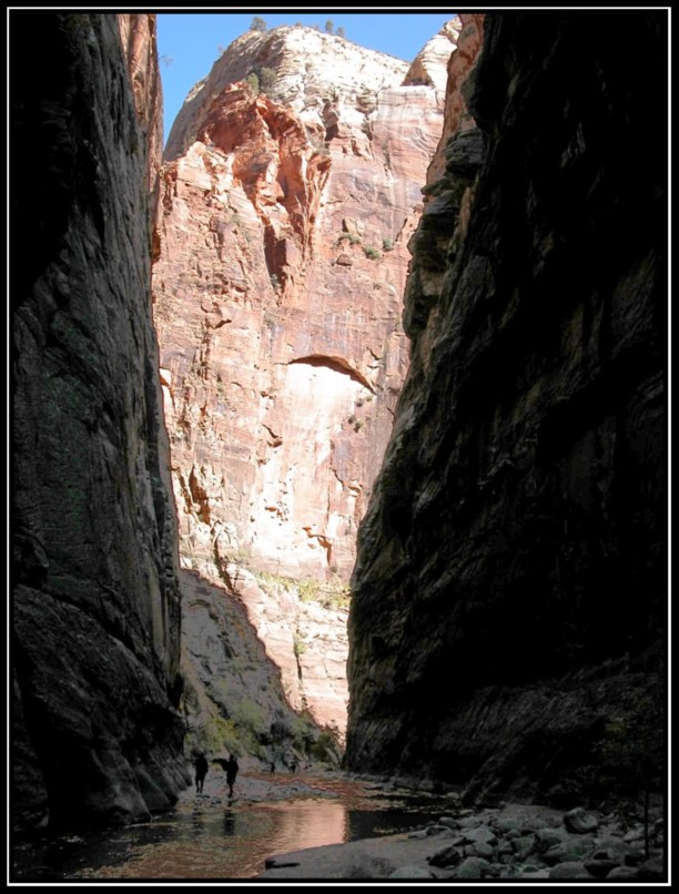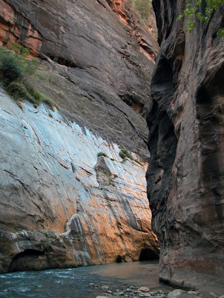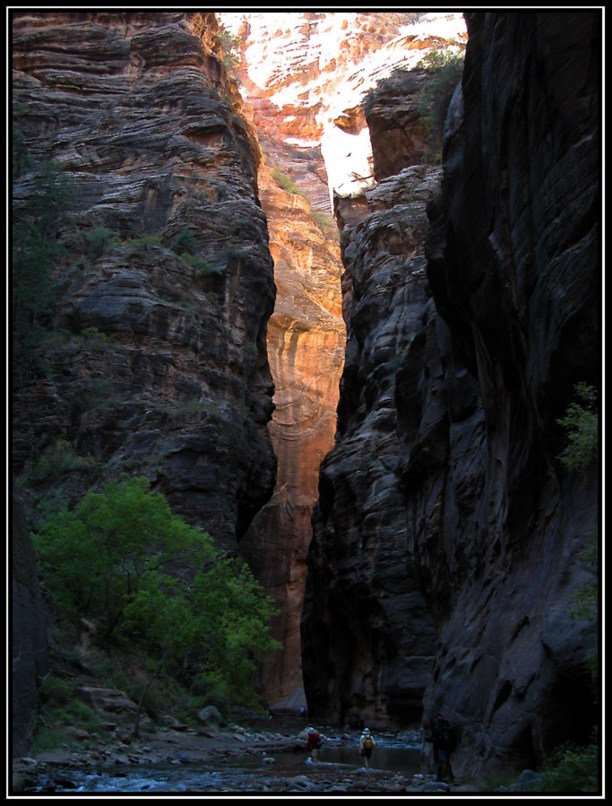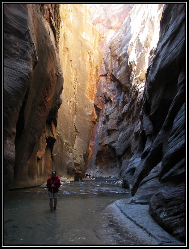 Как я уже отмечал Grand Canyon подавляет величием, Bryce - очень весёлый и живописный. Zion - классический каньон, как о них пишут в детских книгах. Он тянется с юга на север на протяжении 35-50 километров (смотря что считать за границу каньона). С южной стороны, на которой остановились мы, горы сначала собираются в ущелье, которое постепенно сужаясь образует Zion Narrows. Высота стенок там - 100-300 метров. Стенки практически отвесные. По дну каньона растояние между ними колеблется от трёх до десяти метров. В верху порядка 10-20 метров.