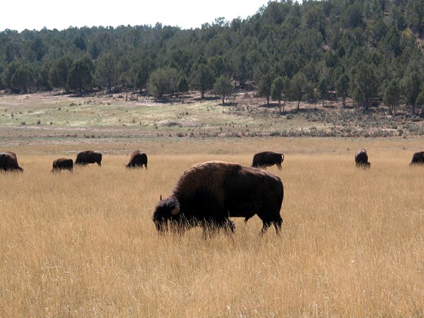 Через два дня, утром мы двинулись в сторону Las Vegas с заездом в Zion Canyon. Это мы уже начали спускаться вниз. При подъезде к западному въезду в Zion Canyon мы случайно наткнулись на пасущееся стадо настоящих бизонов. Понять дикие они или нет мы не смогли. С одной стороны, вокруг минимум на 50-60 миль нет никакого жилья, с другой - не верится, что вот так просто пасётся приличное стадо бизонов.