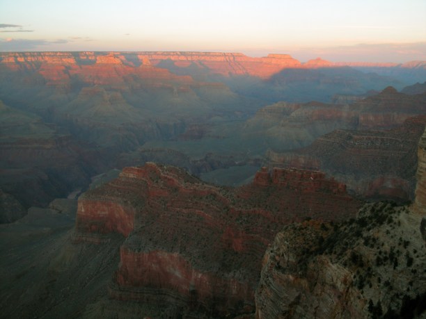 В полдень солнце светит под таким углом, что кажется будто каньон начал светиться бледно розовым цветом.