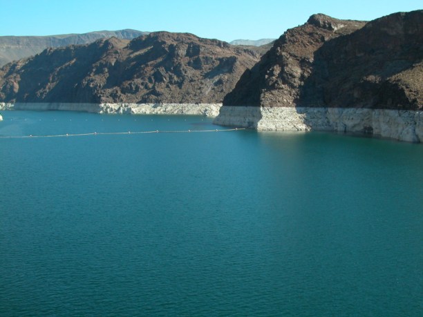 и вверх, на образовавшееся водохранилище (озеро Мид). Обратите внимание на “ватерлинию” вдоль берега. В породе столько много железа, что она натурально “ржавеет” на воздухе, а колебания уровня эту “ржавчину” вымывают. Вот эта белая полоса – диапазон изменения уровня водохранилища.