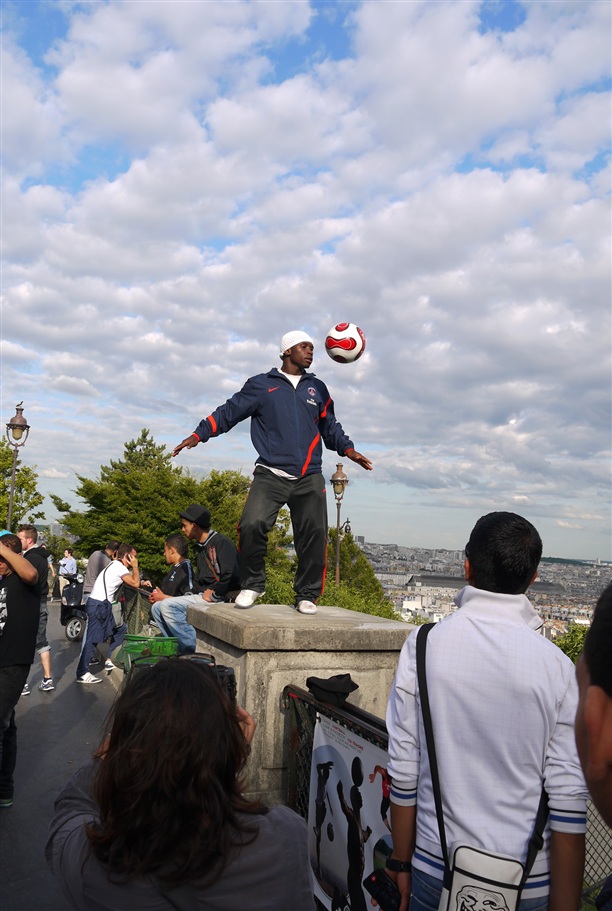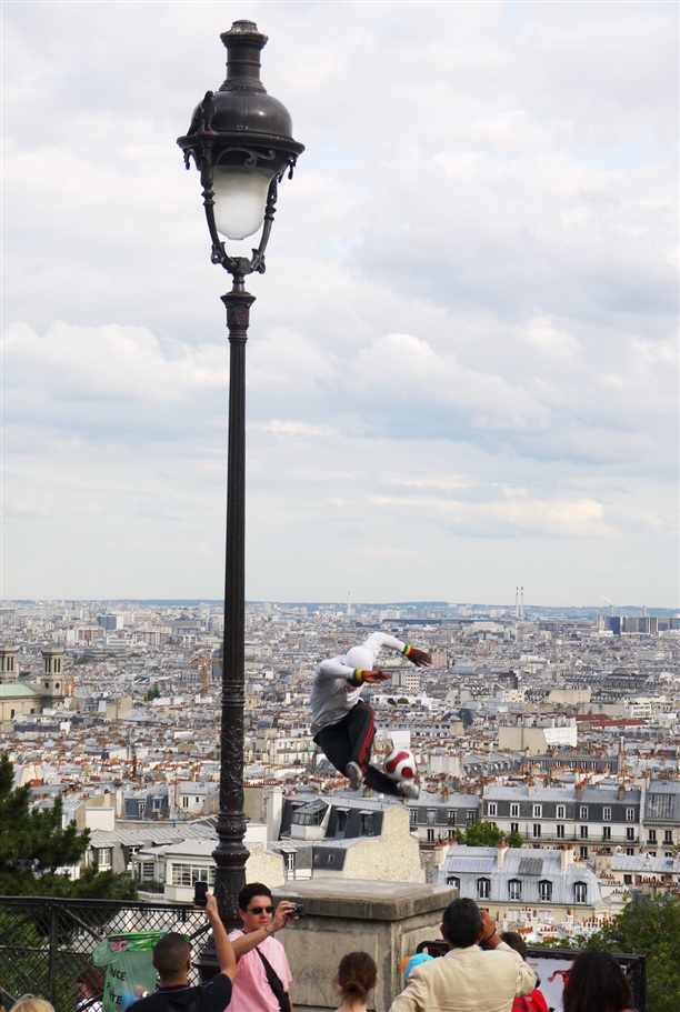 Блин, как же это сказать по-французски??.. Ох**тельный футболист! Не останавливаясь, минут так десять, на маленькой площадке, на высоте, над Парижем, виртуозно меняя трюк за трюком! comme par magie!