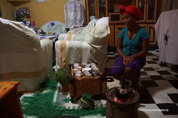 Эфиопия является родиной кофе и его здесь пьют все и по несколько раз в день. Поэтому пока мы ужинали, нам стали готовить кофе. Кофе в Эфиопии пьют в основном «натуральный», то есть берут зерна кофе, сами обжаривают на углях, после того как обжарили - обязательно нюхают аромат. Так что фотография выше не мутная, - это дым от жарящегося кофе.