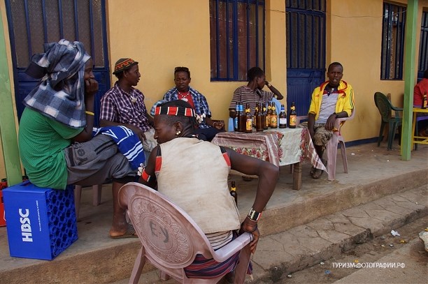 После Мемо Клаб мы отправились в Пиаццу, район в котором располагался наш отель и зашли в первый понравившийся бар. Бар был полный, но нам нашли свободные места. Во время распития алкоголя с соседнего столика нам передали в подарок пиво (белыми в этом баре мы были одни). Мы конечно же сделали ответный жест и эфиопы с восторгом восприняли наш подарок, начали жать нам руки, а один даже, после того как пожал мне руку, поцеловал её. На тот момент я был слегка обескуражен таким поведением. Но в последствии я видел как некоторые эфиопы здороваясь после рукопожатия целовали друг другу руки. Такое поведение считается знаком большого расположения. Через некоторое время мы решили, что пора закруглятся и пошли на выход, взяв с собой по бутылки купленного нами пива. Но уже на улице нас догнал бармен и сказал, что пустые бутылки мы должны вернуть, так как заплатили только за пиво. И такое в Эфиопии повсеместно, на базарах даже продают использованные канистры.