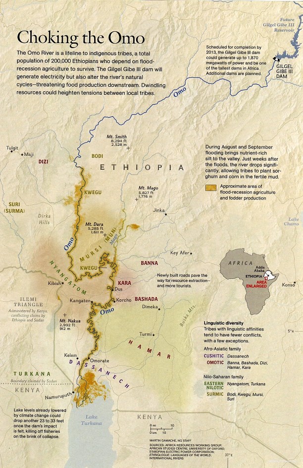 Долина реки Омо считается самым трудно доступным местом на Африканском континенте. И поэтому сюда - на земли, затерянные на границе Эфиопии Судана и Кении, почти не проникают ветры перемен. Живущие здесь около двух десятков племён ведут свой уклад жизни который не изменился за сотни и тысячи лет. Если только туземцы приобрели кое-какую одежду и автоматы Калашникова.
