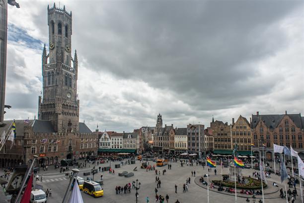 Вид на главную площадь. С левой стороны видна башня городского совета, называется беффруа. Первоначально беффруа служили сторожевыми башнями, где висел набатный колокол. Такая башня была символом свободы города. Постепенно в помещении башен стали размещать зал заседаний городского совета, место для хранения казны, документов, печати, торговые помещения. Так как внутри башен для всего этого не хватало места, то у подножия беффруа стали пристраивать специальное здание. Таким образом постепенно беффруа превратилось в ратушу.