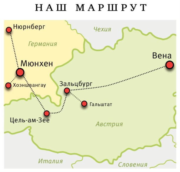- В очередной раз за 12 дней мы попытались объять необъятное. Предварительно забронировав отели в четырёх городах – Вена, Зальцбург, Цель-ам-Зее и Мюнхен – и купив билеты на самолёт, мы отправились покорять Австрию и Германию. В планах были не только городские экскурсии, но и подъём к снежным вершинам, купание в бирюзовых водах альпийских озёр, а также спуск в соляные шахты. В общих чертах это выглядело так…