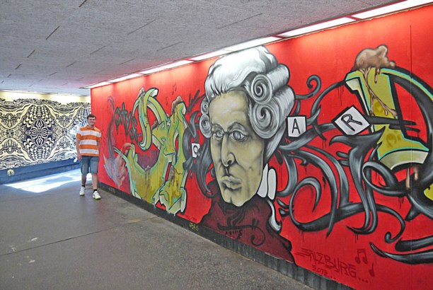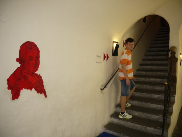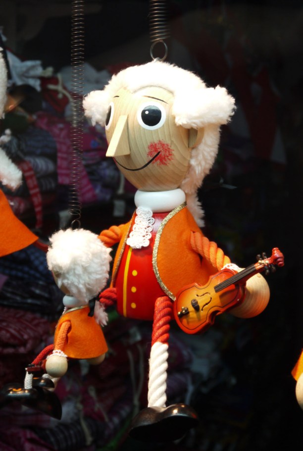 Изображение Моцарта растиражировано по городу в самых разных вариациях: