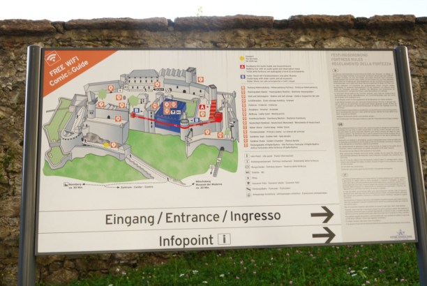 Подняться в крепость можно на фуникулёре, а можно и пешком (тайными тропами). Станция подъёмника находится недалеко от этого господина на золотом шаре.