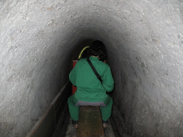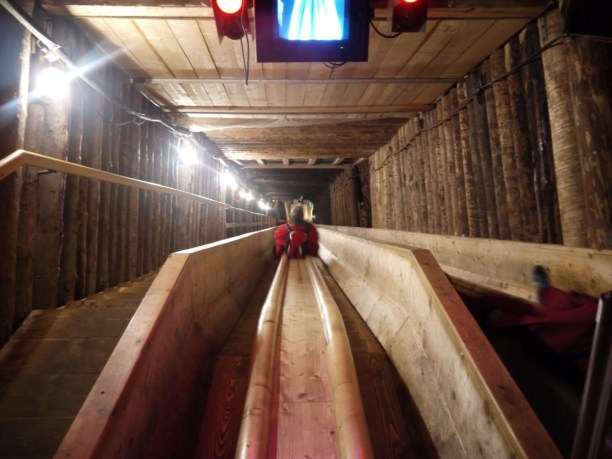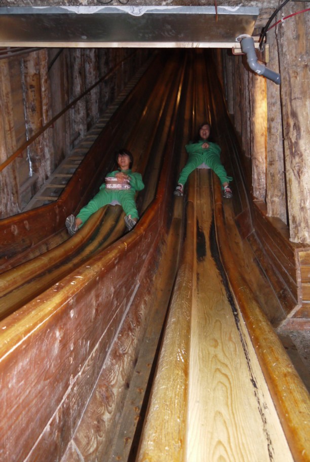 Оказалось, что в копях существуют так называемые переходы между пластами. И чтобы перейти с верхнего "этажа" на нижний, надо спуститься по деревянному жёлобу - 60 метров вниз на скорости 20-30 км/час без каких-либо приспособлений! Просто сел и поехал.