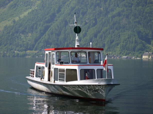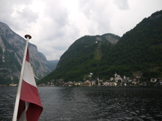 Мы уплывали из Гальштата на последнем кораблике, в 16.45. К тому времени капитан уже был в приподнятом настроении и витал в мечтах о шницеле. Был чудный день воскресенье (к слову, в воскресенье у них вообще мало кто работает). Гальштат провожал нас со слезами. Откуда-то набежали тучки и пошёл сначала шуточный дождь, а потом совсем не шуточный.