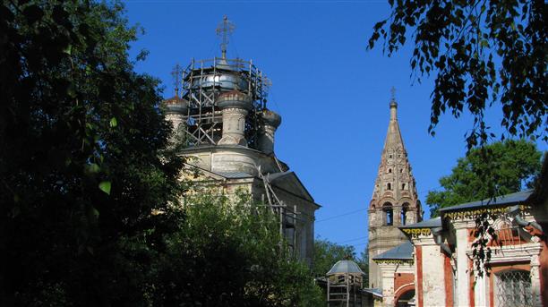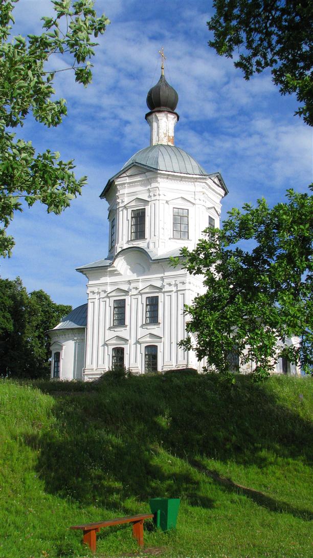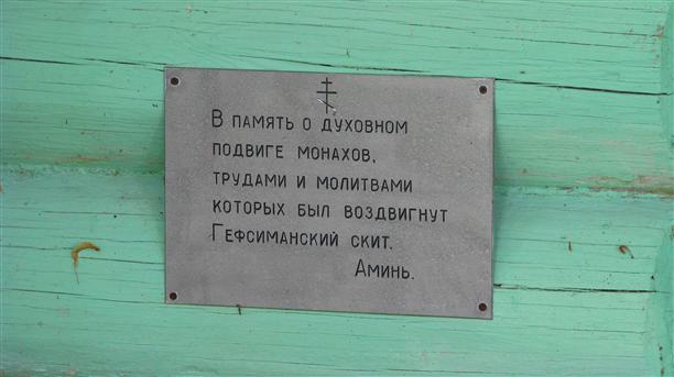 Табличка на срубе древней церкви. Сегодня сама церковь так спряталась среди больших деревьев, что фото совсем не смотрится. И мест для подхода к ней мало, только дорожки.