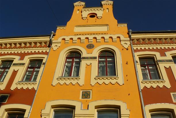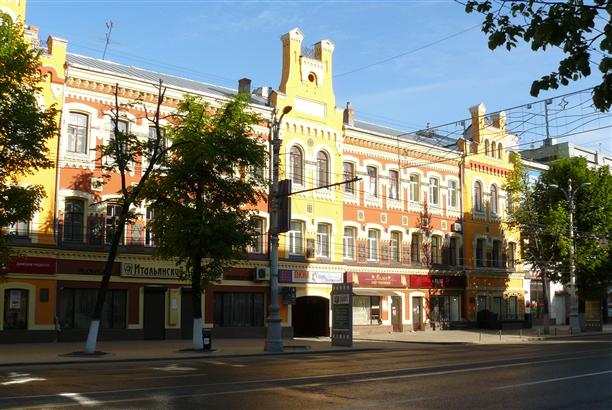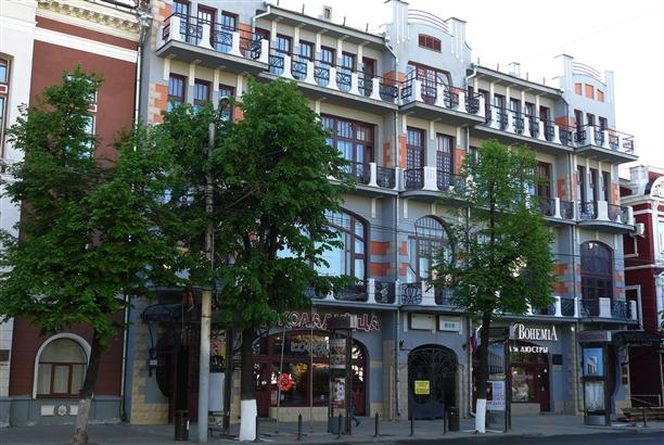 Дом купца Самофалова, построенный в 1878 году (пр. Революции, 42). в нем когда-то размещалась гостиница "Центральная", в которой останавливались Чехов, Маяковский, Мандельштам. теперь это обычный жилой дом, с фасадом в цитрусовых тонах, украшенным майоликовыми мозаиками.