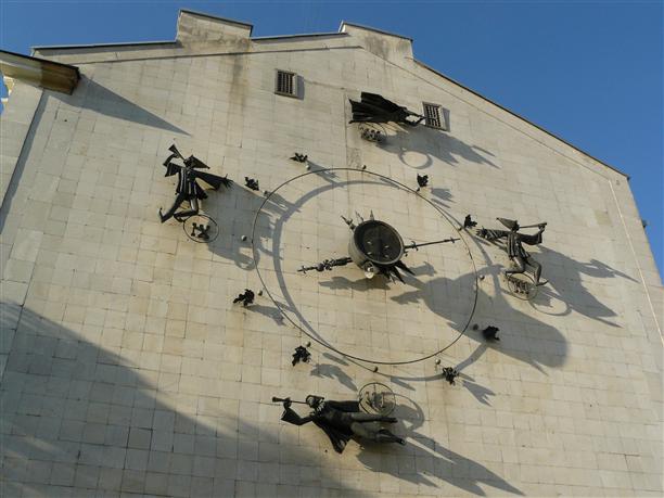 На стене соседнего дома - огромные часы с фигурками.