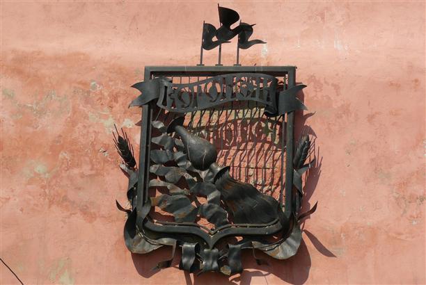 Герб города Воронежа высочайше утвердили в 1781 году. Подлинное описание герба гласит: «Щит разделён надвое: в золотом поле двуглавый орёл, а в красном поле опрокинутый сосуд, из которого истекает река Воронеж». Но это если в цвете и по-настоящему. На старой городской стене тоже висит герб, скорее всего, советский вариант - без орла, но с колосьями и флажками :)