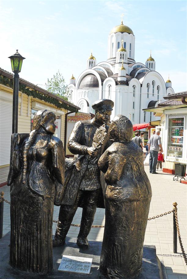 Еще один классный памятник стоит на территории Соборного рынка (ул. Владимира Невского, 47-а). На фоне храма Ксении Петербужской колоритный купец сбывает какой-то бабке пуховый платок. В ходе махинаций с зеркальцем, бабка уверена, что "платок ее молодит", "все такие сейчас носят" и "вообще НАДО БРАТЬ! так как остался последний!" :)) Душевный памятник.