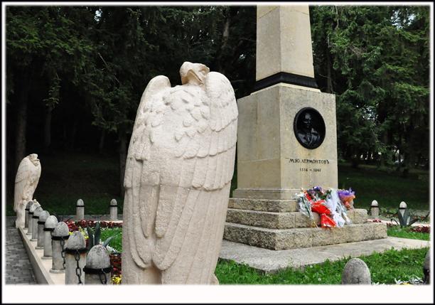 Подкова и стала эмблемой города. Поединок поручика М. Ю. Лермонтова с майором Н. С. Мартыновым состоялся ненастным вечером 15 июля 1841 года. Современный памятник воздвигнут по проекту скульптора Б. М. Микешина. Однако в проект Микешина были внесены серьёзные коррективы, которые не удовлетворили автора. место установки памятника удобно для посещений.Обратите внимание,на повернутые головы грифов .Есть несколько версии этой скульптуры: одна из них отражает друзей Лермонтова,которые отвернулись от него в трудный момент,и не предотвратили дуэли.