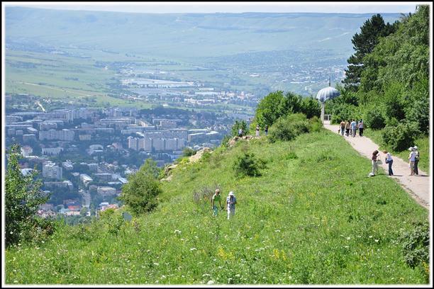Ландшафт города и его окрестностей очень живописен. Город окружают песчаные и меловые горы, образующие многочисленные террасы с глубокими пещерами и гротами. Отдельные глыбы красных песчаников приняли достаточно причудливую форму в результате выветривания. С востока город огорожен холмами, связанными между собой небольшими возвышенностями, и цепью меловых гор, составляющих вместе среднюю часть Джинальского хребта (высота до 1500 м). С севера долина Кисловодска ограничена цепью террасообразных меловых гор Боргустанского хребта, достигающего высоты 1200 м над уровнем моря. Боргустанский и Джинальский хребты являются отрогами Пастбищного хребта, одного из северных хребтов Большого Кавказа. С юга и юго-востока долина Кисловодска ограничена куэстами Скалистого хребта — Кабардинским хребтом высотой до 1600 м и Бермамытским плато, изрезанным ущельями рек Аликоновки, Березовки и Ольховки.