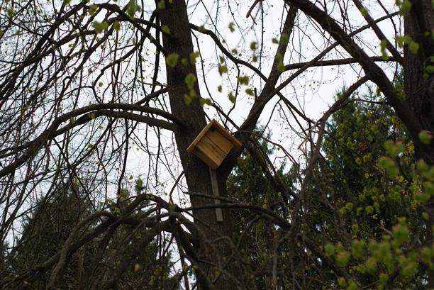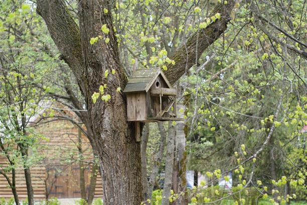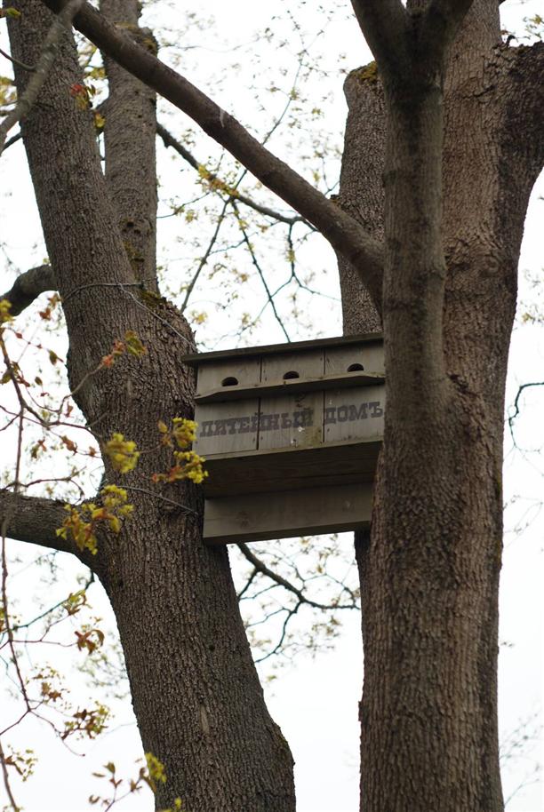Также увидел в усадьбе несколько необычных скворечников. Первый в виде общежития на трех жильцов, с надписью "Питейный дом".