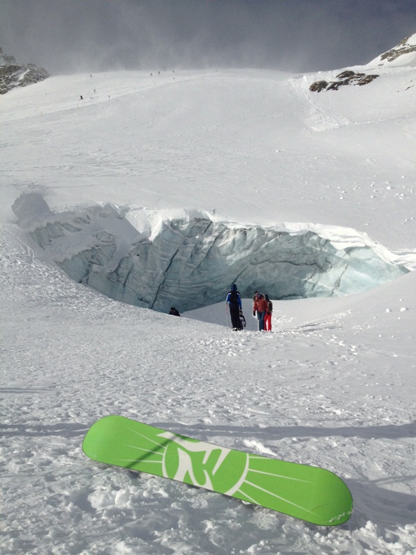 Ледник во всей своей массе двигается не равномерно, например ему приходиться огибать хребты и скалы, в некоторых местах замедляясь, а в некоторых наоборот - ускоряясь. Это приводит к напряжениям в толще ледника и образованиям трещин. Эти трещины в альпийских ледниках достигают 30 м. Иногда их можно наблюдать прямо с горнолыжных трасс. К примеру, вот такой грот - всего в 150 метрах от трассы - был хорошо виден с подъемника.