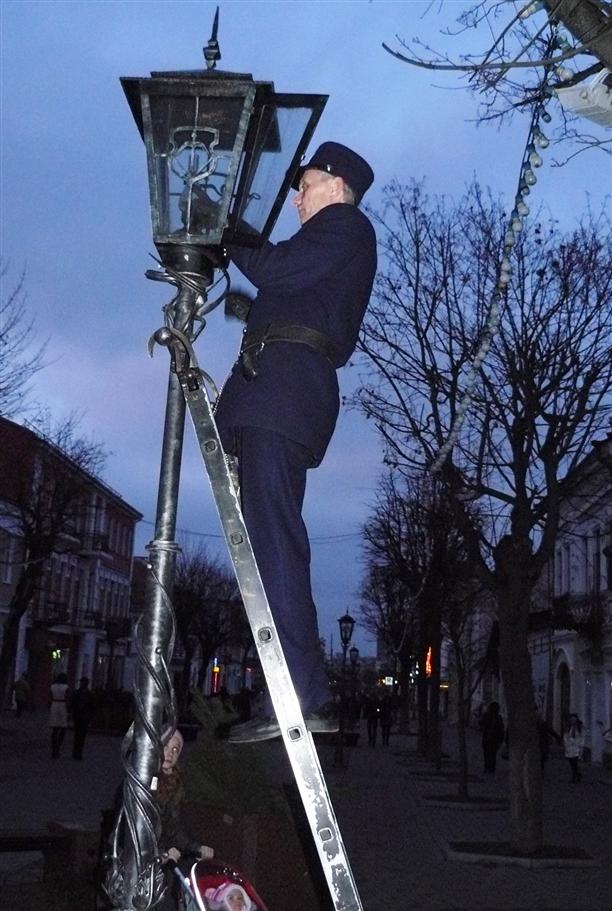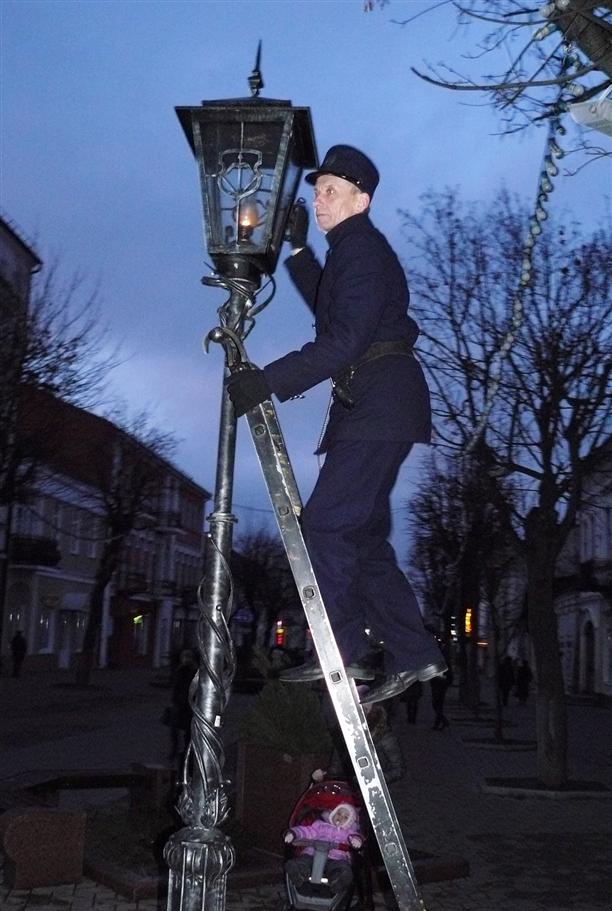И ровно в половине шестого на улице появился фонарщик! Этакий франт петровских времен - в фирменном кителе с блестящими золоченными пуговицами, в картузе с лаковым козырьком и с длинной лесенкой в руках. По ней он поднимался к каждому из керосиновых фонарей и зажигал их, не спеша и с каким-то особым достоинством. Всего на улице Советской девятнадцать старинных фонарей! :)