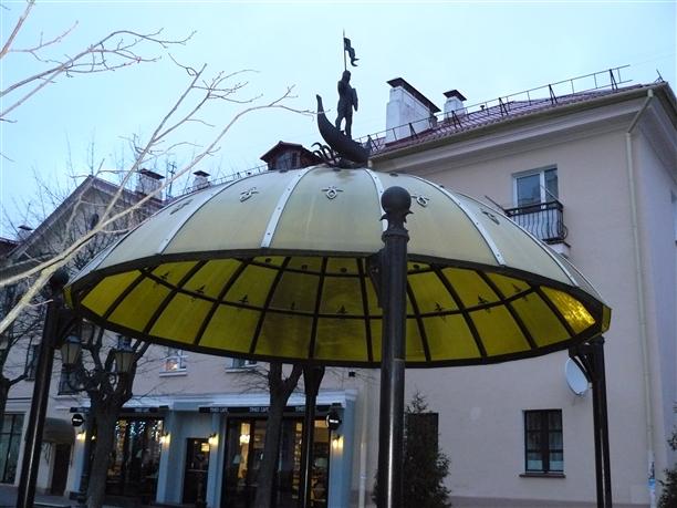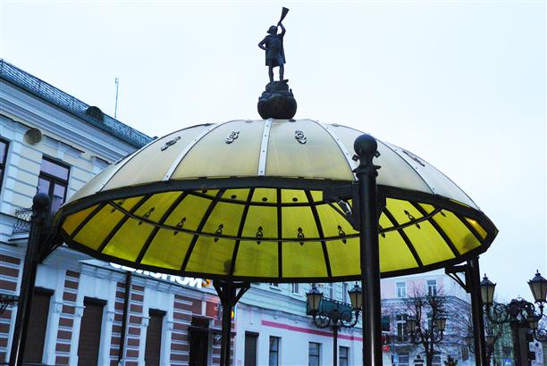 Улицу украшает несколько беседок, цветные купола которых увенчаны разными затейливыми фигурками :) На одном, похоже, Серебряный мальчик из "Приключений электроника" :)