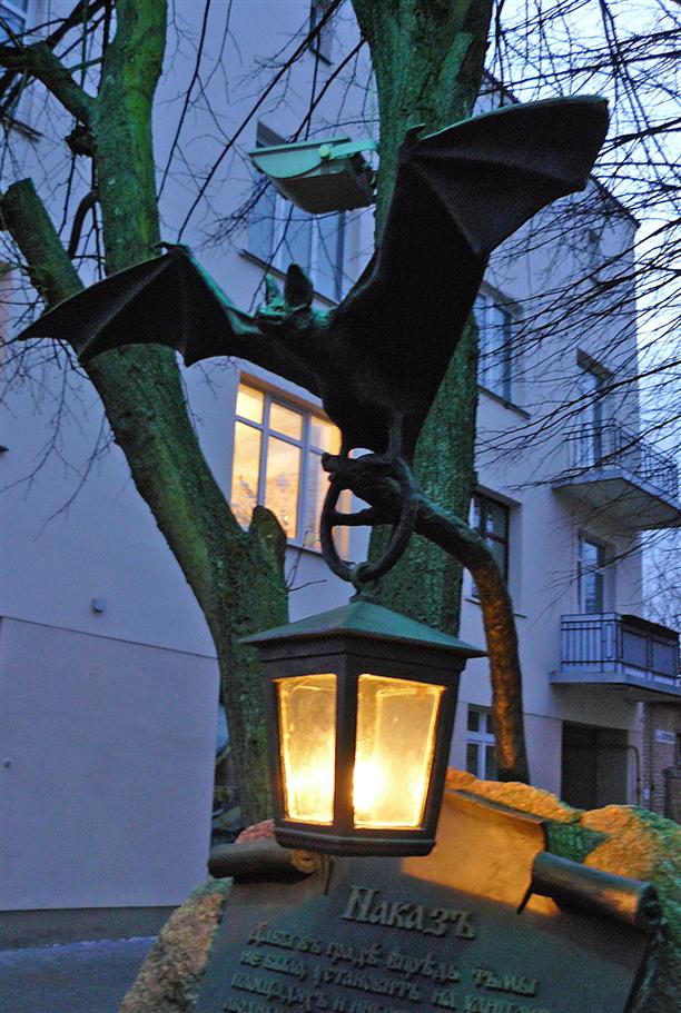 На Советской "живёт" еще один интересный персонаж - летучая мышь. Она сторожит "наказ". На свитке написано, что фонарям постановляется гореть всегда и в любую погоду.