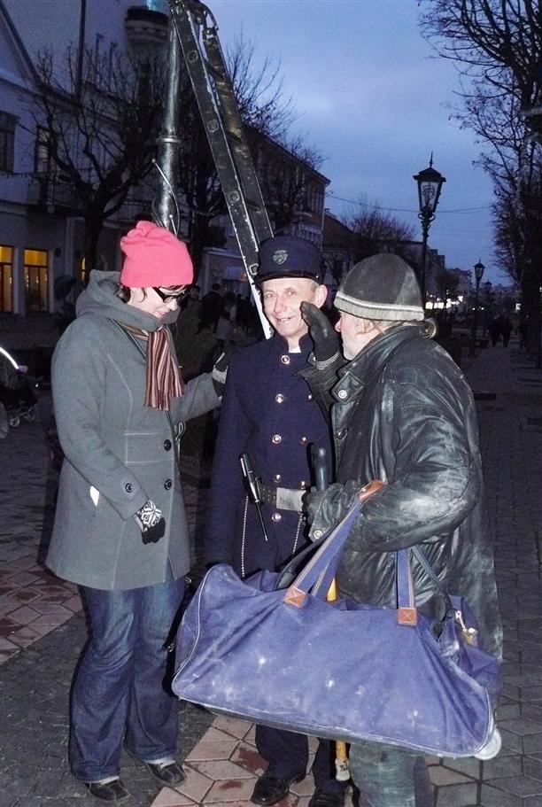 Говорят, если потереть пуговицу на кителе фонарщика - будет удача! Пока я разбиралась с этой традицией, к нам подошел какой-то нищеброд и привычно ухватился за пуговицы фонарщика :)))))) Узнав, что мы из Тулы, обездоленный завозмущался: "А почему без самовара?!" Виктор Петрович (фонарщик) в наш разговор не вмешивался, а просто гостеприимно улыбался :) Удивительный человек.