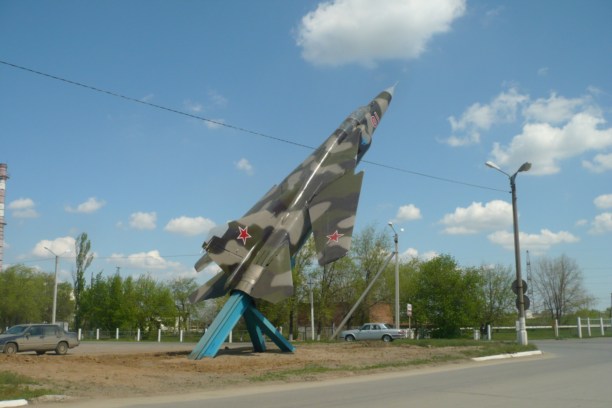 Так мы и не поняли, почему стела криво стоит, да и не в этом дело! В городе оказался "Магнит", и мы решили пополнить запасы провианта. Трогаемся дальше. Пока выезжали из города, вспомнил, что в Ахтубинске есть большая военно-воздушная база, но жена меня охладила, что всё необъятное не объять)) Пришлось довольствоваться монументом в самом городе...
