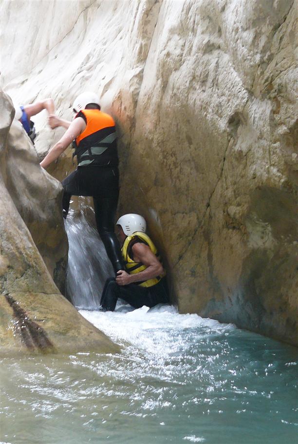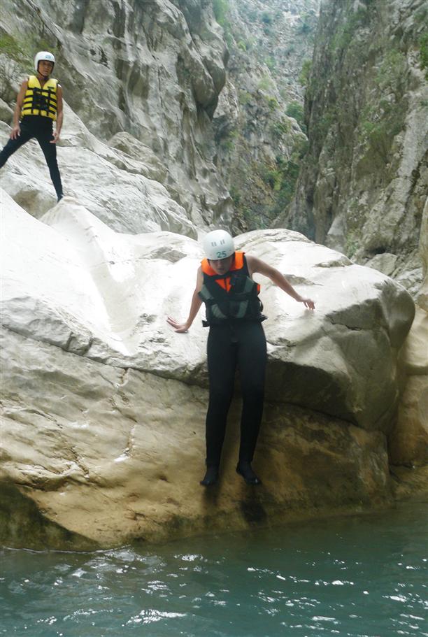 К счастью, в путешествии по каньону нас никто не сопровождал (никаких гидов!) Шли, как первопроходцы :) Нащупывая дно, выбирая маршрут, сами решали, когда акробатировать, залезая друг другу на плечи, а когда прыгать в воду, скатившись по гладким камням.