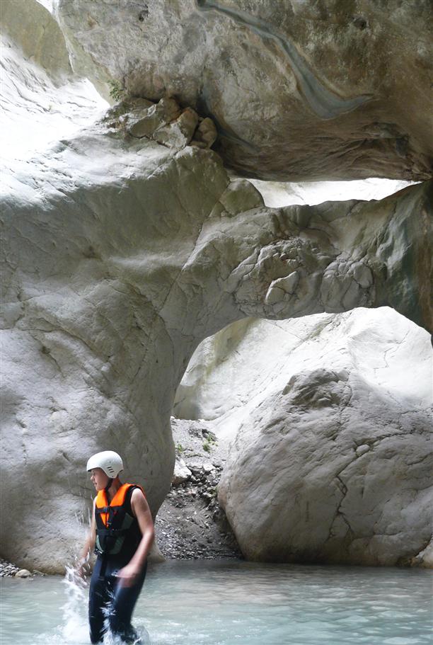А когда стоишь у белой каменной стены, отшлифованной бурными потоками, и тебе виден всего лишь краешек спрятанной в глубине первозданной красоты, можно разум потерять! Желание УВИДЕТЬ БОЛЬШЕ растет с каждой минутой! А вода ледяная... и глубоко... а на тебе еще и фотоаппарат висит (не за три копейки). В общем, бизнес у деда был стабильный :) Упс. Теперь всё иначе. Дороги расширили, а вместо турка с утлой лодочкой поставили так называемый "офис", где за отдельную плату выдают гидрокостюмы, специальную обувь, спасательные жилеты и каски. То есть платишь не за вход в каньон, а за всю эту амуницию, от которой вполне можно отказаться.