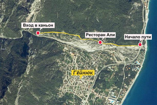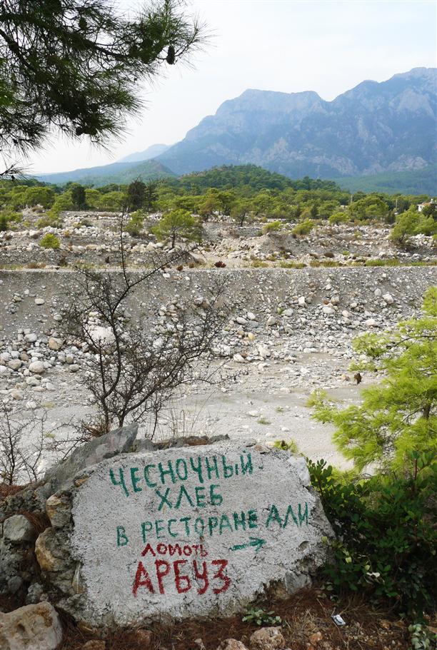 А дальше все просто – берешь эту карту, садишься в долмуш, доезжаешь до Гёйнюка (от Кемера 10-15 минут езды), проезжаешь знаменитый гёйнюкский глобус, выходишь сразу за мостом, а дальше идешь вдоль русла реки по стрелкам в горы (километров шесть!)