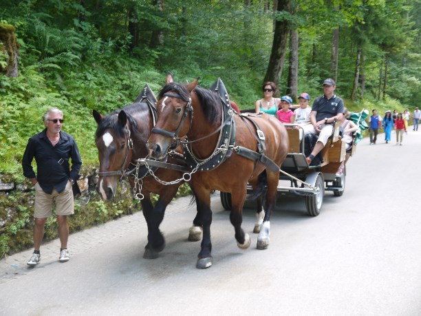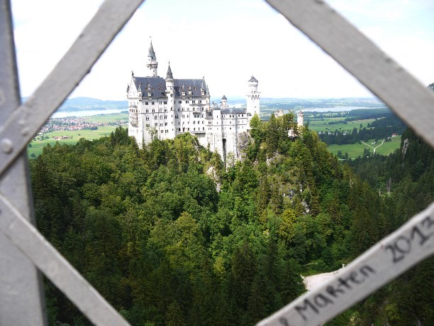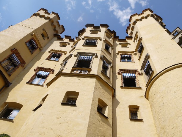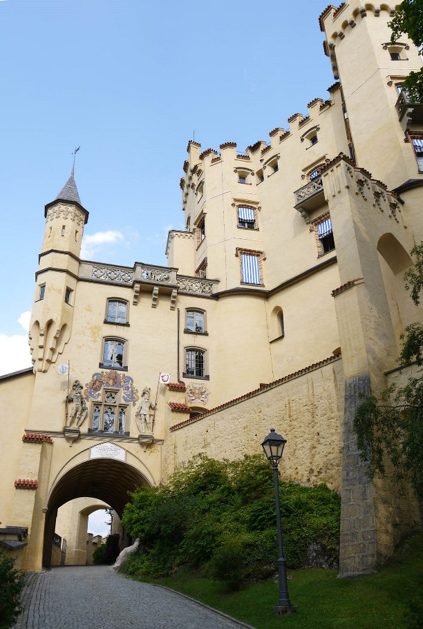 Название замка переводится как «новый лебединый утес». Королевский приют расположился на скале на высоте 965 метров и чтоб коснуться рукой его стен, придётся основательно прогуляться. Для ленивых: до замка можно прокатиться на автобусе (1,8 евро) или на конной повозке (6 евро вверх, 3 евро вниз). На автобус - длиннющая очередь, а тяжеловозы едут очень медленно и нудно, к тому же по дороге они роняют килограммы г**на :)